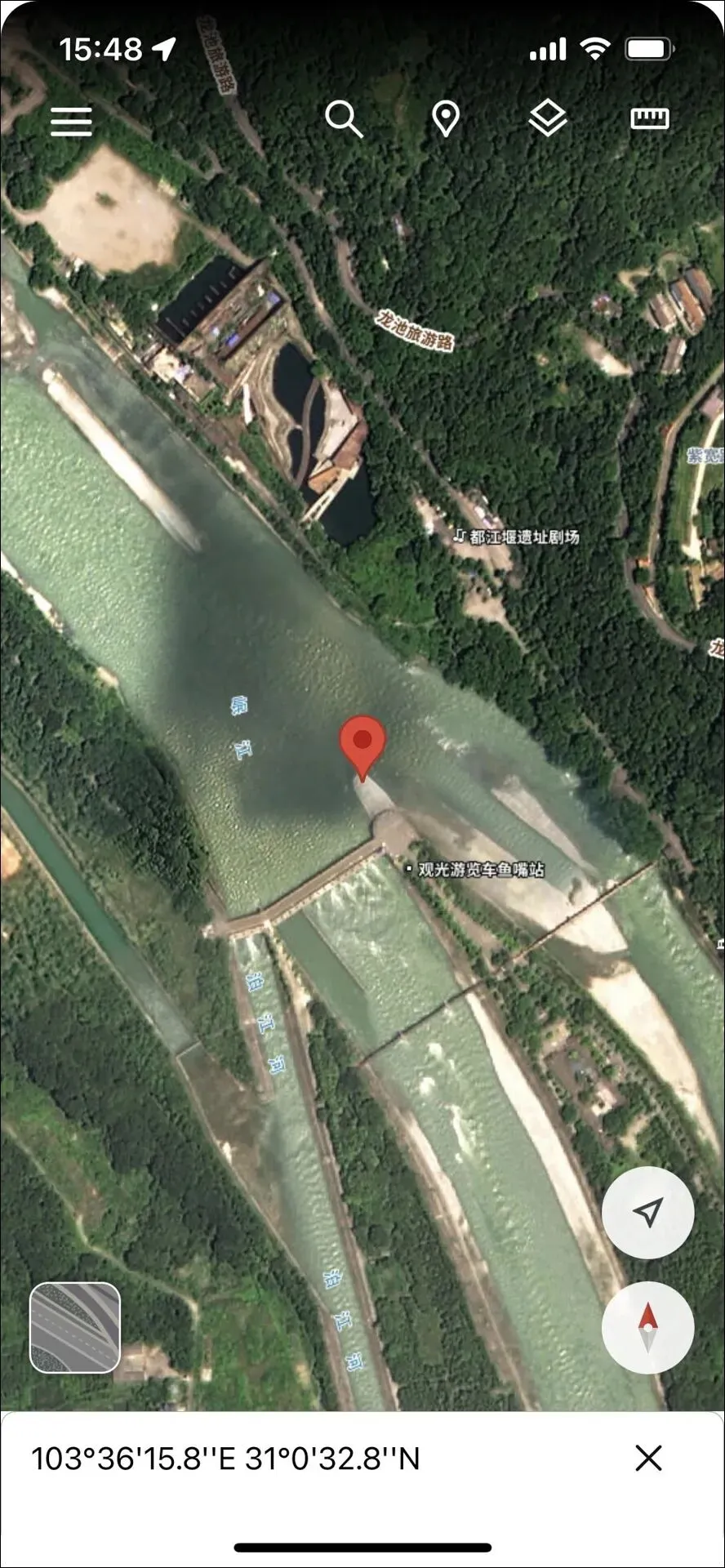 这里以“103°36’15.8″E,31°00’32.8″N”或“31°00’32.8″N,103°36’15.8″E”查询定位为例,如下图所示,定位结果为著名水利工程都江堰。