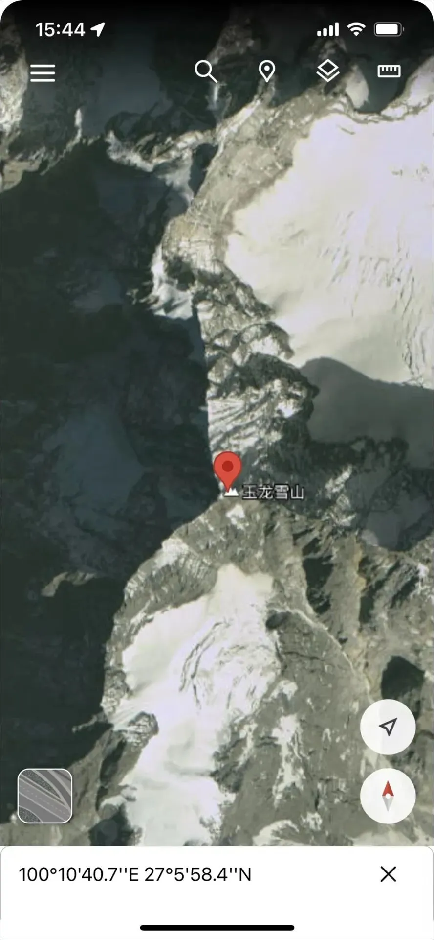 这里以“100°10’40.7″东,27°05’58.4″北”查询定位为例,如下图所示,定位结果为玉龙雪山。