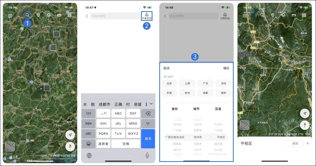 点击【搜索】图标,点击【行政区划】,选择行政区划,点击【确定】,即可通过行政区划的方式搜索定位区域。