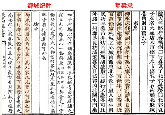 《都城纪胜》作于南宋,写明“自中兴行都已百余年”。但吴自牧在借鉴抄录的时候,时间已经不一样了,特改写为,“高庙车驾由建康幸杭,驻跸几近二百余年。”