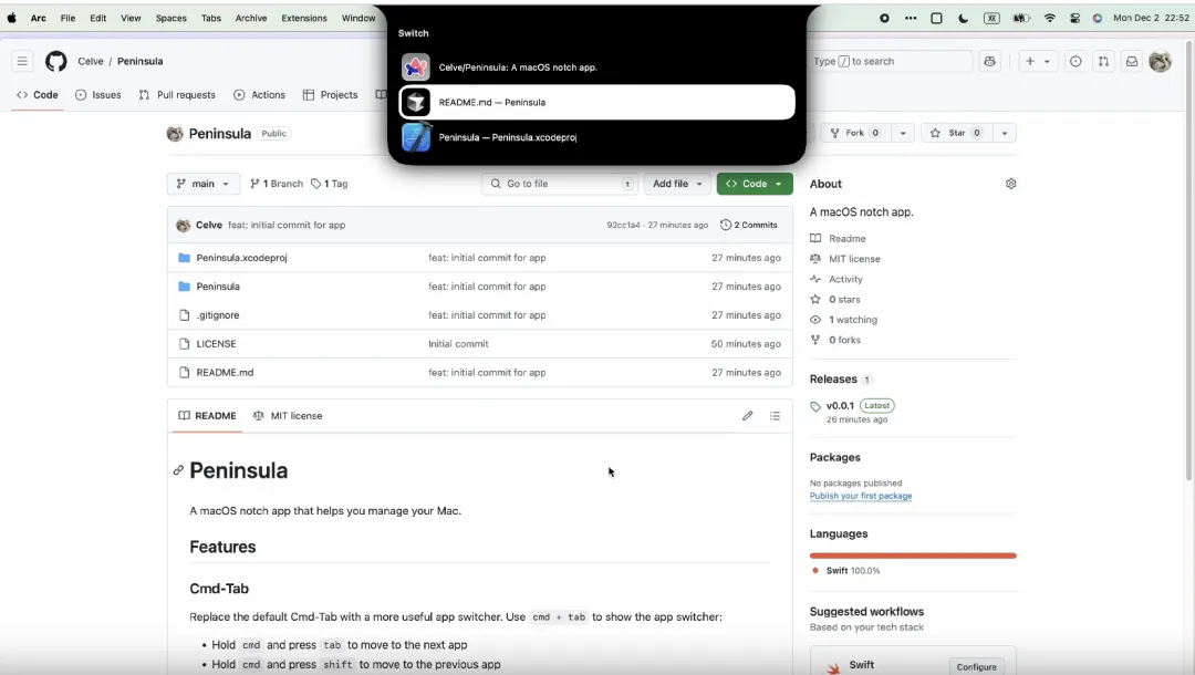 Peninsula 的核心功能是窗口切换。按下 Command+Tab 时,它会把所有打开的窗口平铺在刘海下方,继续按 Tab 即可依次切换。与系统自带的切换器相比,Peninsula 的优势在于能识别同一 App 的多个窗口——比如在访达里打开了两个文件夹,它会分别显示,而不是合并成一个。