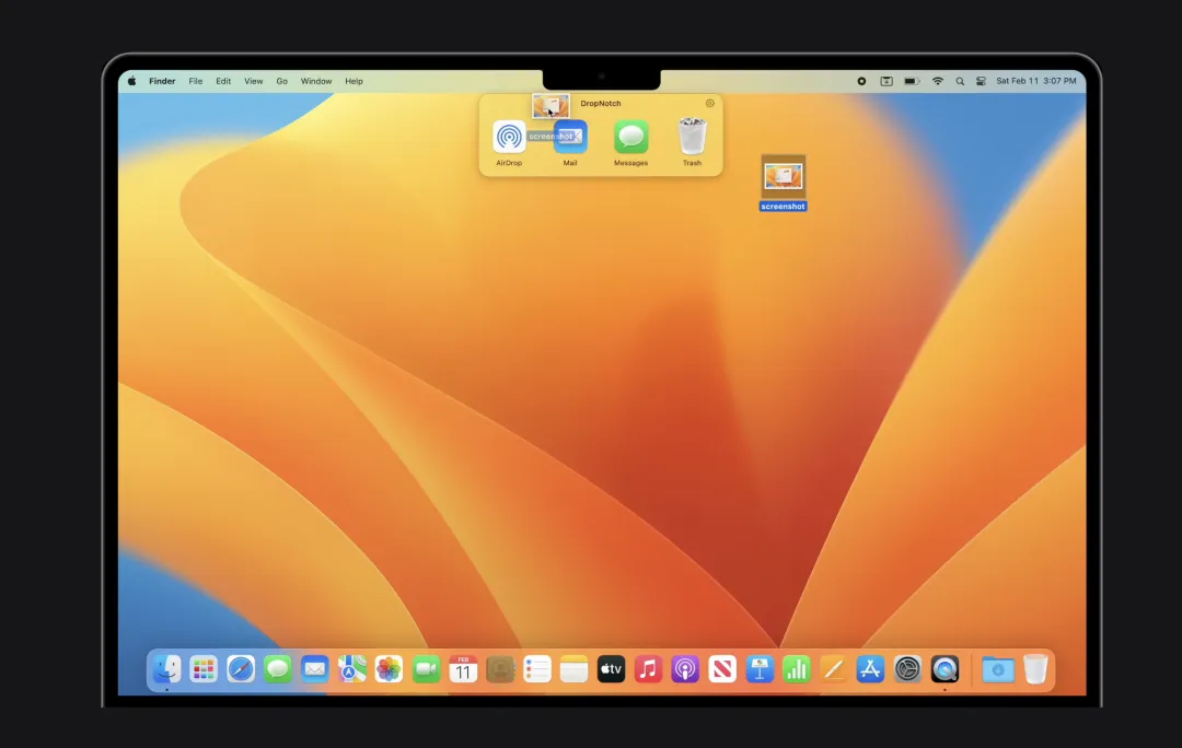 它的功能只有一件事:把刘海变成文件传输的快捷入口。把文件拖近刘海,底部弹出拖放区,可以直接发起 AirDrop、作为邮件附件发送,或者扔进垃圾桶。没有动画,没有额外功能,整个流程干脆利落。