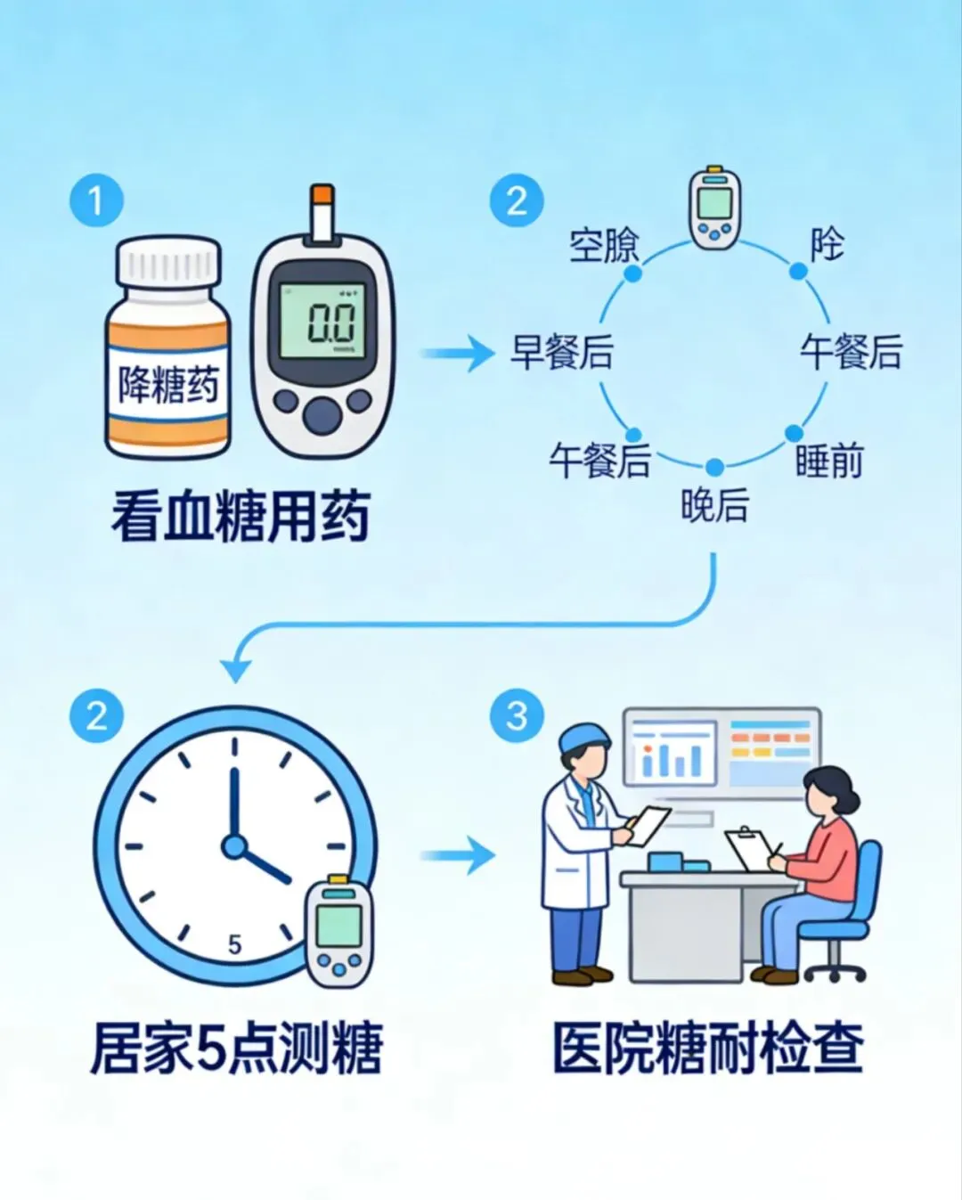 定期测空腹、餐后、糖化血红蛋白,及时调整方案,把高血糖对胰岛的伤害降到最低。