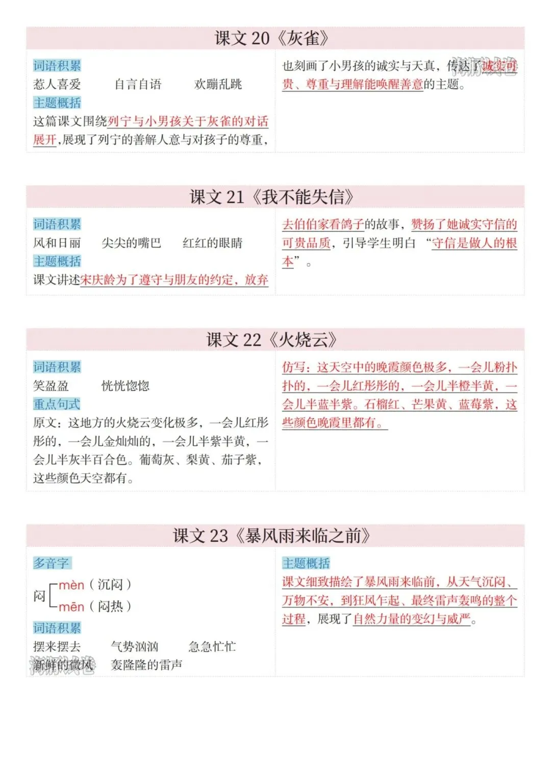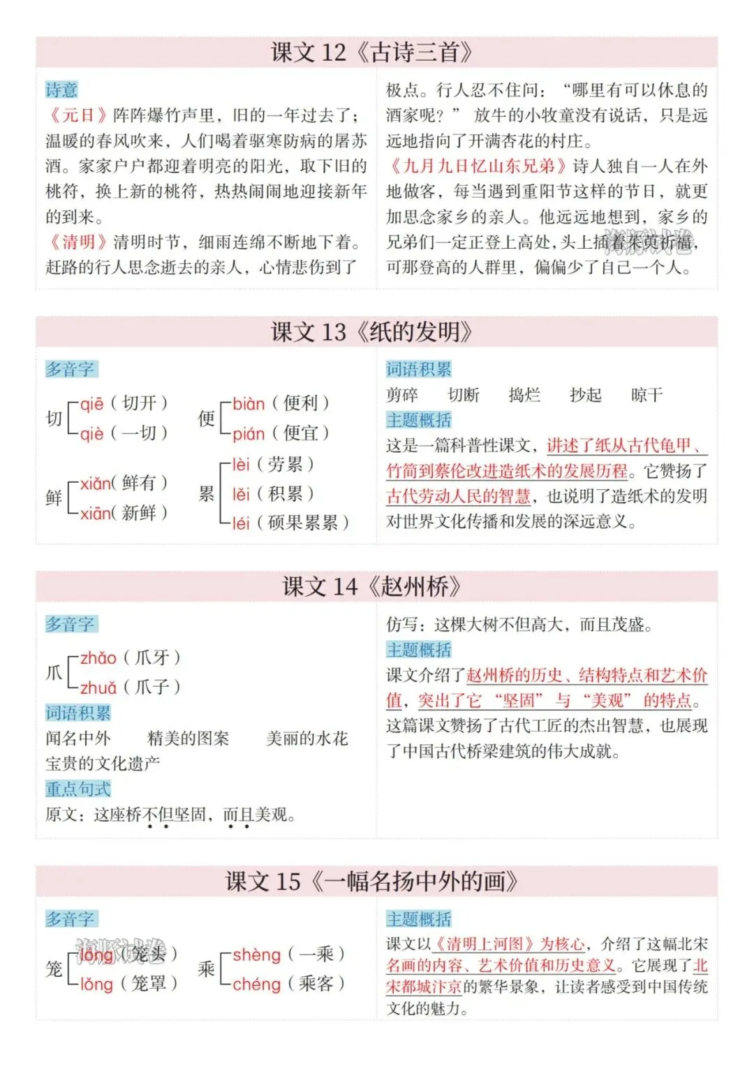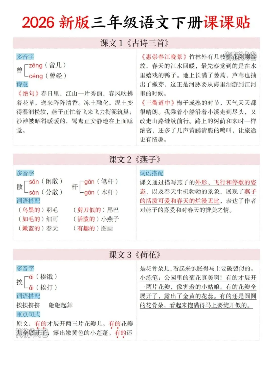 26年春三年级下册语文《课文课课贴》电子版可打印,这份26年春三年级下册语文课文课课贴包含了三年级下册语文全册必备知识点汇总,包含多音字,古诗诗意词语搭配等知识点,可以提前练习下册所学的重要考点,需要的家长打印下来每天给孩子背诵一下吧。