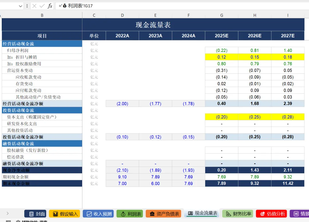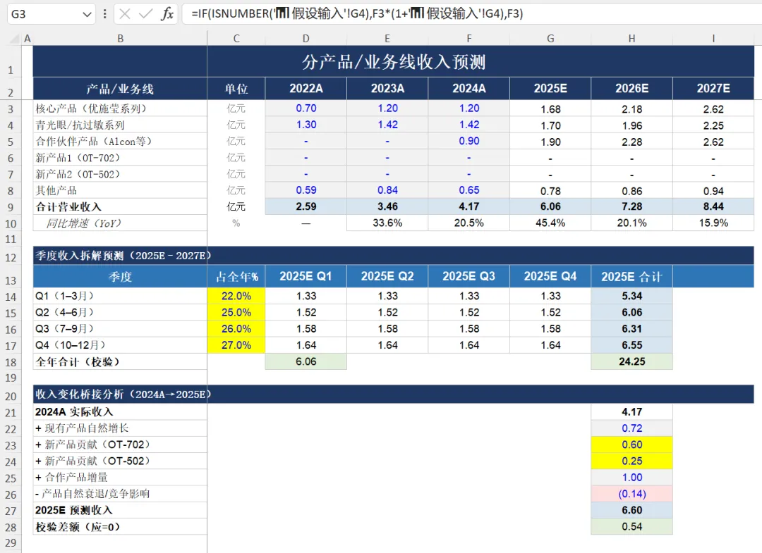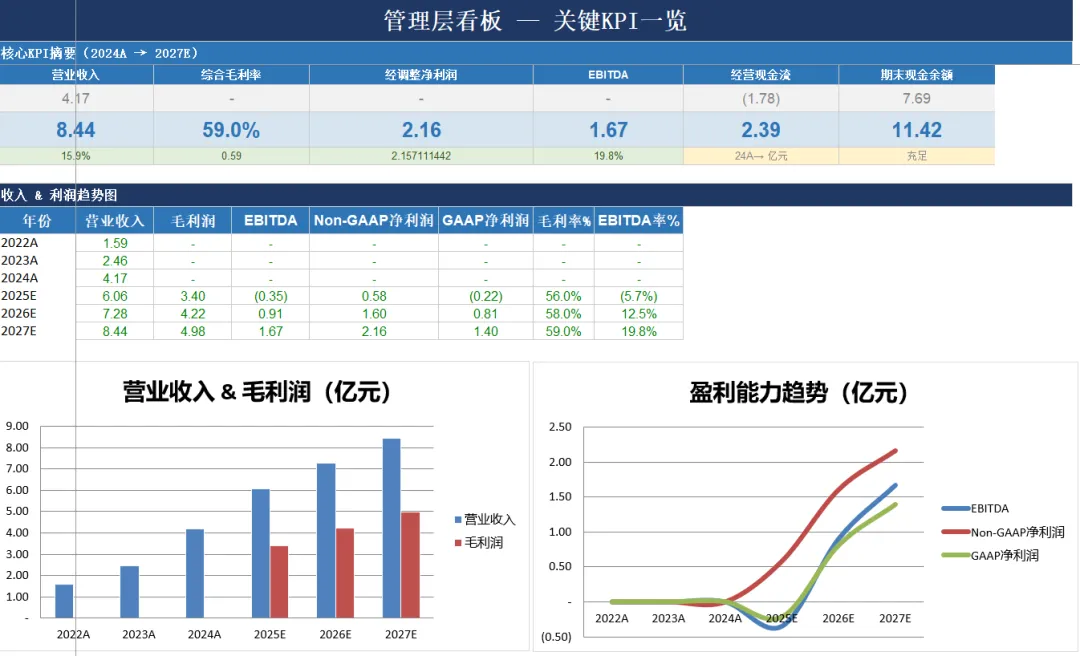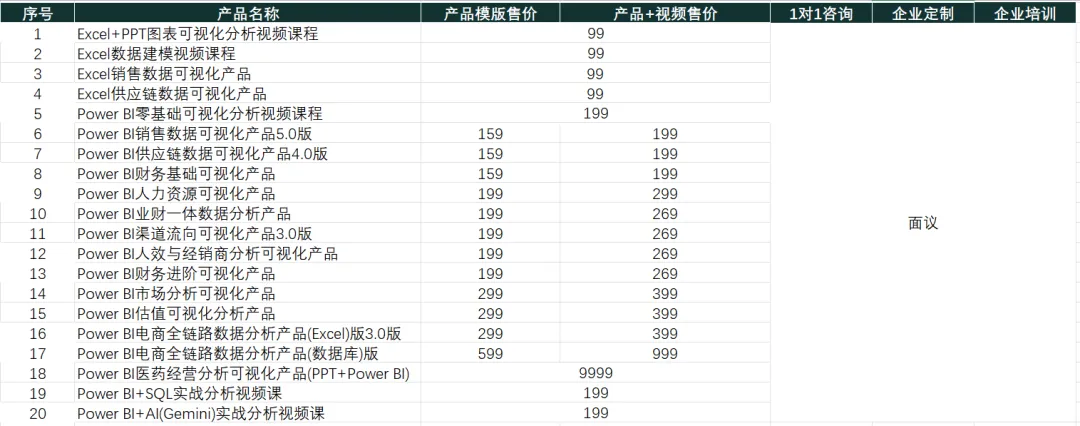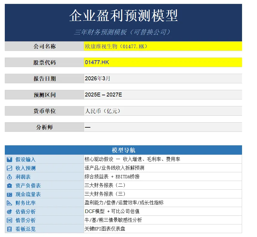 Excel+Power BI企业盈利预测模型看板 如下图是Excel+Power BI企业盈利能力模型,在模型导航中,从9大页面进行详细系统的分析介绍,具体内容包含假设输入,收入预测,利润表,资产负债表,现金流量表,及指标体系(财务比率),估值分析与情景分析是对DCF模型的应用,最后做了一张看板总体的概览。 在具体的核心假设输入模块中,从产品收入,毛利率,各类费用,运营体系指标,资本及折旧及最后的估值假设进行了参数的输入,这里的参数输入直接影响到后续的相关的盈利模型的报告表。 在产品业务线收入预测模型中,通过基准前的参数输入,结合假设运营模版的参数,就能得到产品及业务线收入的预测,并通过拆解到具体的季度,完成季度的收入预测分析。 接下来的财务常规的三张报表,资产负债表,利润表,现金流量表都是根据前面的运营假设输入及产品业务线收入预测结合基准年份的数据得到预测结果值。具体如下 结合上述的基础假设与产品线及财报报表,得到企业关键财报比率分析,这里从盈利能力指标,成长性指标,偿债能力指标及运营效率指标体系,这块内容在之前的Power BI建模中有详细系统的产品模版,具体如下 PowerBI上市财报可视化产品4.0版 最后估值分析模型通过前面的三张财报及基础假设,场景敏感性分析,结合DCF模型算法得到自由现金流预测,结合企业现金终值与贴现,得到企业价值EV,同时也对WACC与永续增长率参数进行了多个值的模拟设计,具体如下图 最后做了管理层核心KPI看板,这块内容结合上述Excel建模在Power BI完成更有效率与价值,如下链接 PowerBI上市财报可视化产品4.0版 Power BI+Excel数据可视化分析产品+视频目录完整版,具体链接如下 2025PowerBI零基础可视化分析课程 PowerBI销售数据可视化分析产品5.0版 PowerBI供应链基础数据可视化产品4.0版 PowerBI渠道流向管理数据可视化分析产品3.0版 PowerBI人效与经销商分析可视化产品 Power BI上市财报可视化产品完整版 PowerBI预算分析可视化产品 Power BI应收账款可视化分析看板 PowerBI业财一体零基础实战应用 PowerBI上市财报可视化产品4.0版 PowerBI市场分析可视化产品1.0版全网首发 PowerBI上市公司估值可视化产品1.0版 Power BI电商数据分析产品(含PPT与视频版) Power BI+SQL医药企全链路经营分析 医药经营分析会产品Power BI+PPT1.0版 SaaS+Power BI供应链渠道流向与合规分析产品 Excel从入门到进阶可视化分析看板课程 Excel销售数据可视化产品 Excel供应链数据可视化产品