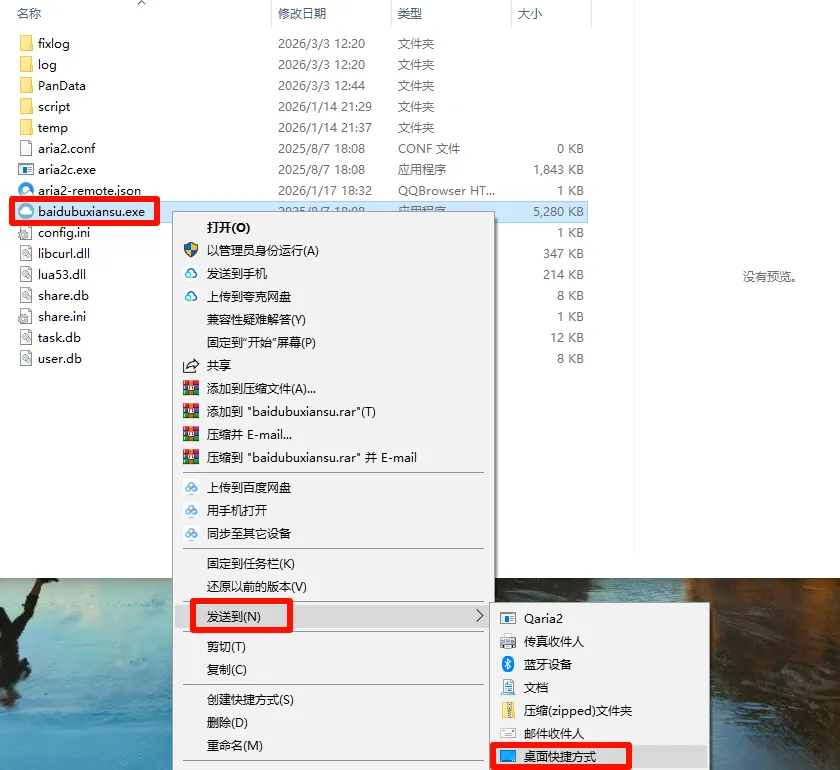 为了日后使用更加顺手,我建议大家在“baidubuxiansu”程序文件上右击鼠标,选择“发送到”中的“桌面快捷方式”。如此一来,下次想要使用时,直接在桌面双击快捷方式就能轻松打开软件。