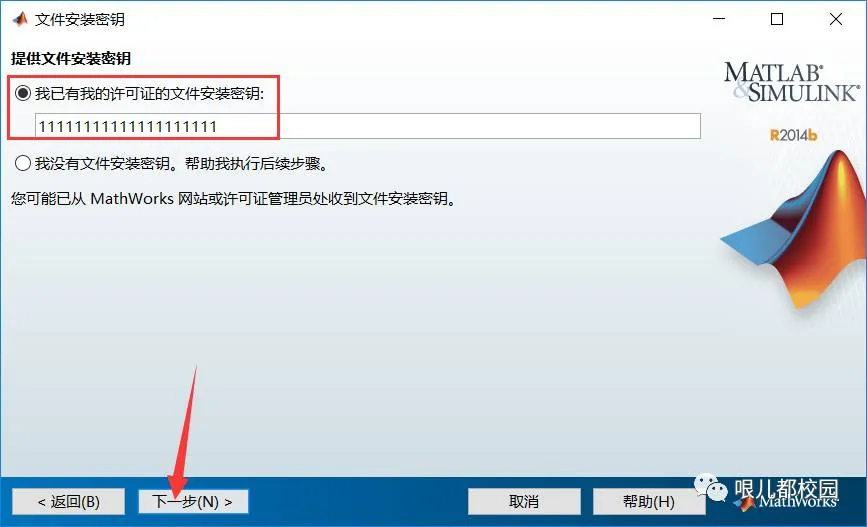 6.选择“我已有我的许可证的文件安装密钥”,在下面输入秘钥:“11111111111111111111”(20个1),然后点击“下一步”