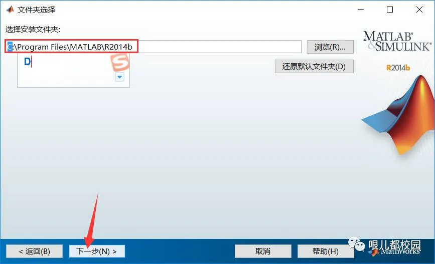 7.接下来选择安装路径(软件较大不建议安装在C盘)。可以使用默认路径,也可以自行更改(路径中不要有中文即可)。然后点击“下一步”。如下图默认路径为:C:\Program Files\MATLAB\R2014b 可以直接将C改为D,安装到D盘