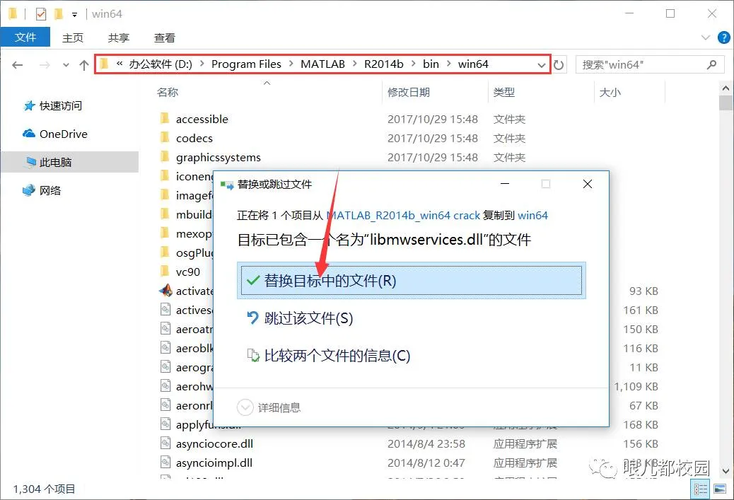 15.找到安装目录(默认为:C:\Program Files\MATLAB\R2014b\bin\win64)进入该文件夹,粘贴刚刚复制的“libmwservices.dll”文件,然后点击“替换目标中的文件”