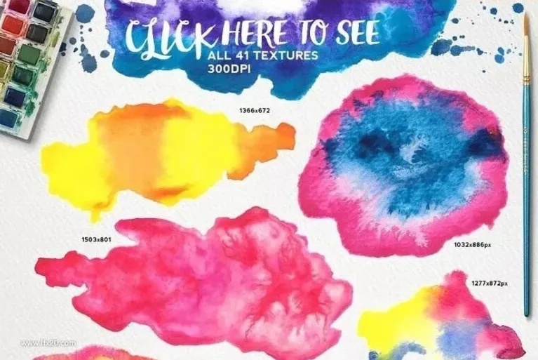 套装内包含41种高分辨率的水彩渲染素材,每款均在专业画纸上经由真实颜料层叠、晕染而成。这些素材拥有300DPI的出众清晰度,保留了水彩特有的干笔边缘、湿画晕染以及自然的色相偏移,为您提供丰富的视觉底蕴。