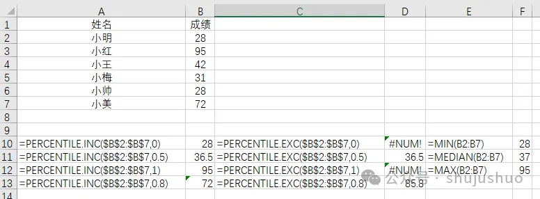 示例中,设置k值是0.8,计算的是如果想超过80%的人,得考多少分。数组集的个数是6,两数相乘得到的结果是4.8,此时函数会对成绩分数进行从小往大排序,计算排名在4.8的个数,因为没有小数排名,所以Excel会采用内插法进行计算,得到一个介于倒数第4和第5名之间的分数值。至于到底是怎么内插计算的,说实在的,小编也没研究明白,不过50%中位数还是比较清楚的,如果是奇数,就是中间的那个,偶数个的话,就是中间相邻两数的平均值。