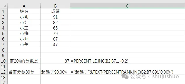 示例中,是一份考试成绩表,最大值、最小值和平均值给都已经很熟悉了,今天咱们要算的是前20%的分数多少,或者说,想进入前20%,得考多少分,这里要注意的是percentile.inc函数的k值设置,一定要记住要和前多少反着来。
