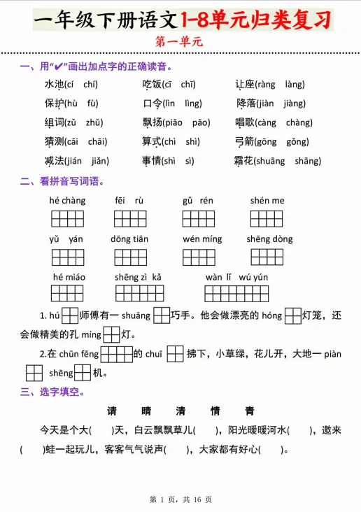 【免费下载】一年级(下)语文 1-8单元归类复习,PDF电子版,可打印