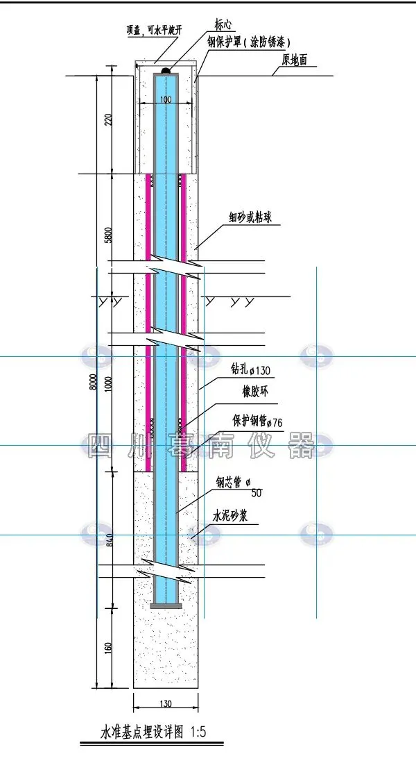 A)产品结构:双金属管标装置主要由保护罩、测读仪器( 位移计或测量器具)、水准标志、钢管、铝管、孔口装置、保护管、支撑环、底盖等组成。