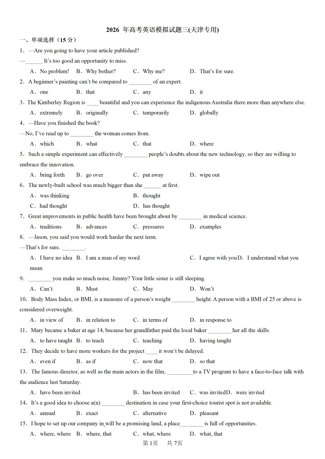【可打印】③2026 年高考英语模拟试题三(天津专用)(附解析) 点击上方“蓝字”免费关注! 本套试卷+答案解析下载入口 关注“卿卿侃古今”公众号 点击左下角阅读原文可下载 相关链接: 【真题】2007-2025年天津市高考英语真题汇总(持续更新中~) 【真题】2011-2023年天津高考英语听力真题在线测试 【模拟】2025届高三英语听力机考模拟试题在线测试 【可下载】2025-2026年高中英语试题汇总(附解析)【持续更新中】 【可下载】2025-2026学年度高一高二高三开学考试模拟试卷(天津专用)(附解析) 【目录1】高中英语阅读理解限时训练大全(持续更新中~) 【目录2】高中英语完形填空限时训练大全(持续更新中~) 【目录3】高中英语书面表达大全(持续更新中~) 【目录4】高中英语听力训练大全(持续更新中~) 【目录5】高中英语单选题大全(持续更新中~) 【目录6】高中英语语法题大全(持续更新中~) 【目录7】高中英语阅读表达题大全(持续更新中~) 【目录8】科普知识汇总 【目录9】中高考学法知识汇总 【目录10】高考英语真题+名校模拟真题+月考和期中期末试题(持续更新中~) 【目录11】暑期高考英语备考资料大全持续更新中~【汇总】中高考志愿填报资料大全 【汇总】高中英语月考和期中期末试题(持续更新中~) 【汇总】2025届高三英语一模试题(附解析) 【汇总】2025届高三英语二模试题(附解析) 【汇总】2025届高三英语三模试题(附解析) 【汇总】2024届高三英语一模二模三模试题(附解析) 【汇总】2024届高考英语押题卷(附解析) 【汇总】2025届高三英语周考综合练(附解析) 【汇总】免费下载!2025年天津高考押题预测卷英语试卷12套全(附解析) 【汇总】2025年高中英语期中考试试题(持续更新中~) 【汇总】2024年高中英语月考和期中期末试题(持续更新中~) 【题库】高三英语限时训练(持续更新中~) 【题库】高三英语试题汇编(持续更新中~) 【题库】高二英语试题汇编(持续更新中~) 【题库】高一英语试题汇编(持续更新中~) 【高考词汇】(新)外研版高中英语全七册词汇表(附音频) 【中考词汇】初中英语外研版必备单词表(完整版),可打印 建议收藏保存 点击阅读原文查更多