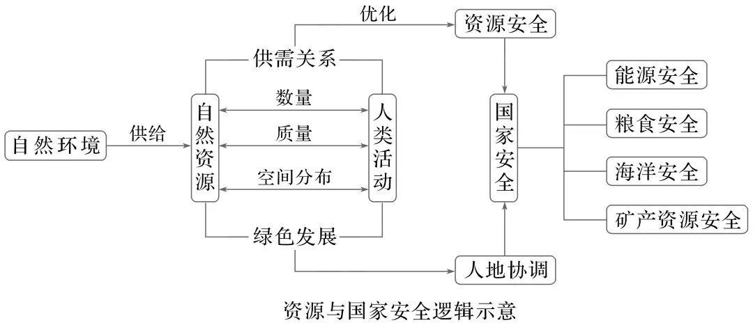 “资源与国家安全”围绕自然资源与人类活动的相互关系这一主题而展开,研究资源安全的最终目的是实现自然资源供给能力的可持续发展,即人地协调发展。因而理解“资源与国家安全”的逻辑路线,需要将人地关系贯穿始终。首先从自然资源整体出发阐明与人类活动的关系,而后进一步从资源供给与人类需求关系的角度分析资源问题的发生机制。当事关国家与人类生存和发展的战略资源出现重大问题,对国家尺度区域的影响超过一定阈值后便会影响到国家安全。在此基础上,从人地协调的视角提出资源安全的保障途径,由此形成“资源—资源安全—国家安全—安全的保障”这一思维逻辑路径。