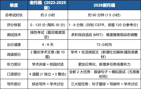 不同于以往小修小补的调整,2026版托福的改革堪称脱胎换骨!总结一下,新托福改革最突出的4个点: