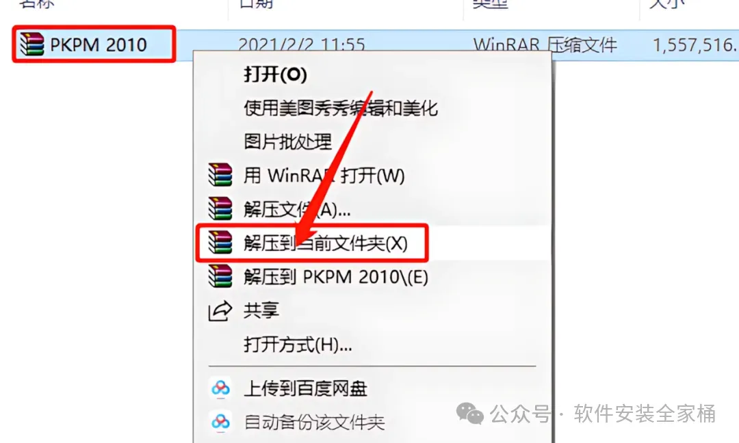 1.打开下载的PKPM 2010软件安装包,鼠标右击压缩包选择【解压到PKPM 2010】。