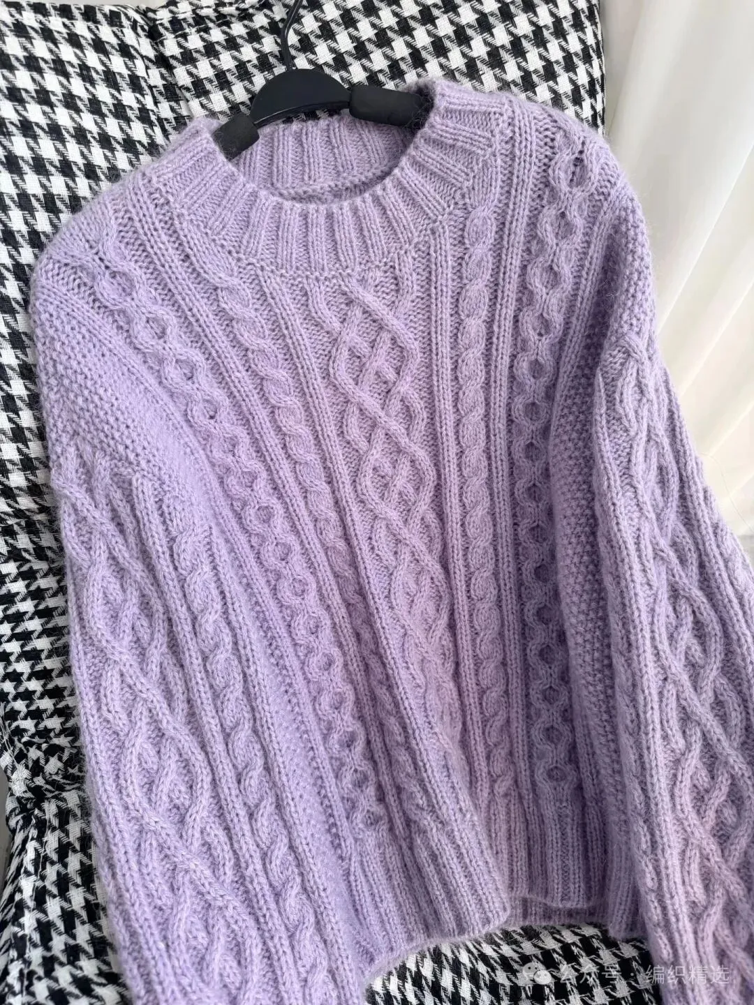编织说明:整件衣服包含袖子都是从下至上片织后缝合,先从后片开始,然后前片,缝合后挑织衣领,最后织袖子。每个人的线材不同,手的松紧度不同,织出来的尺寸也会不同,建议先织小样进行测量,然后根据自己的线材适度调整针数及针号。