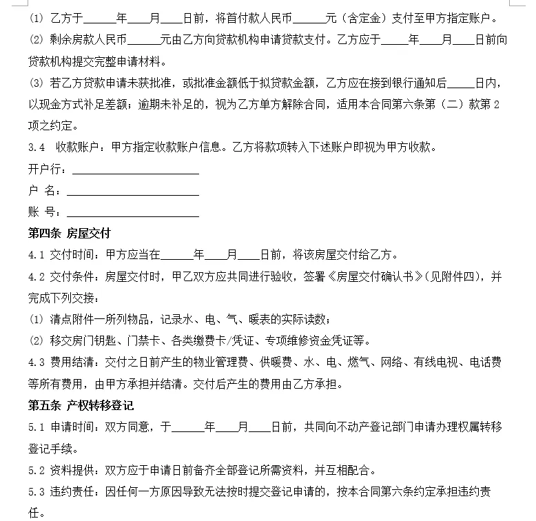 (2) 双方共同向不动产登记部门申请办理权属转移登记,并于取得记载有乙方姓名的新不动产权证书当日,将剩余房款人民币___________元一次性支付至甲方指定账户。
