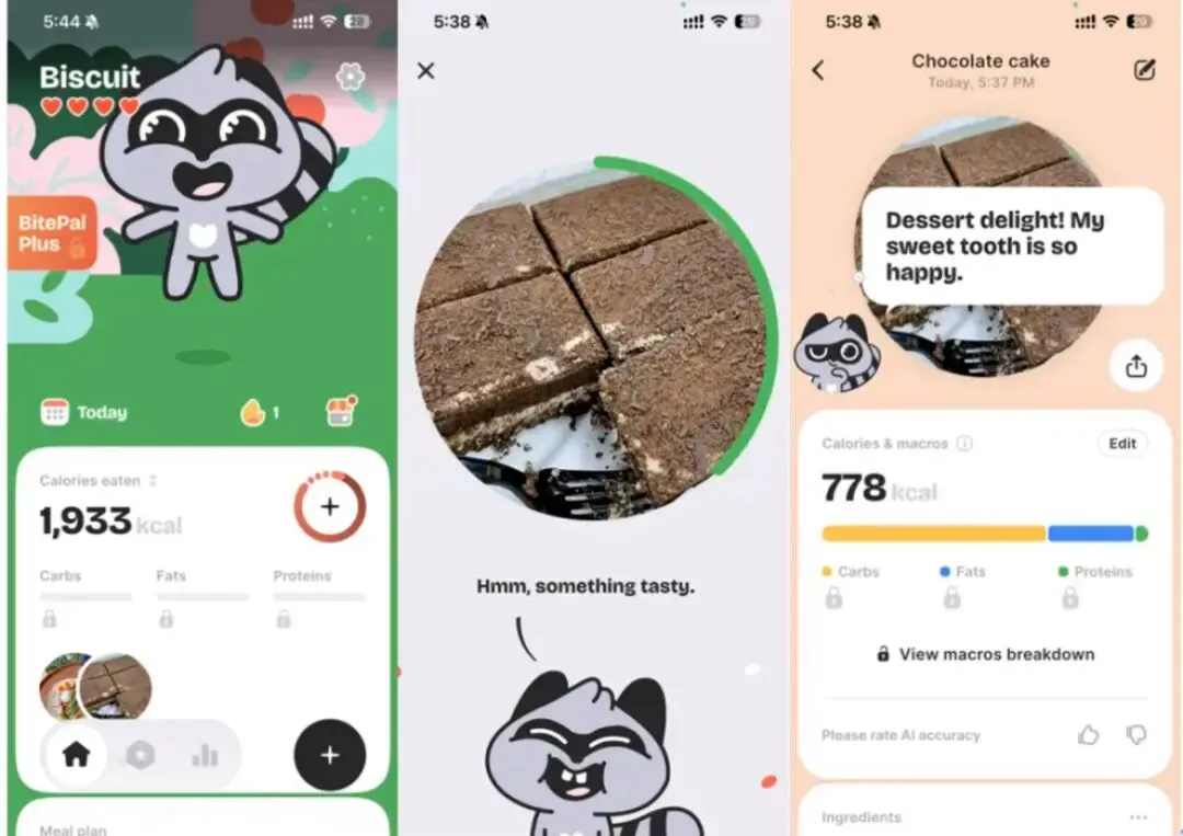 BitePal的出现,精准击中了赛道的痛点,从产品设计到功能呈现,都与老牌应用形成鲜明差异,而一只可爱的小浣熊,成为其最核心的记忆点。