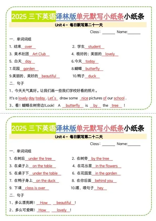 26新译林版三下英语单元默写小纸条(完整电子版可打印)