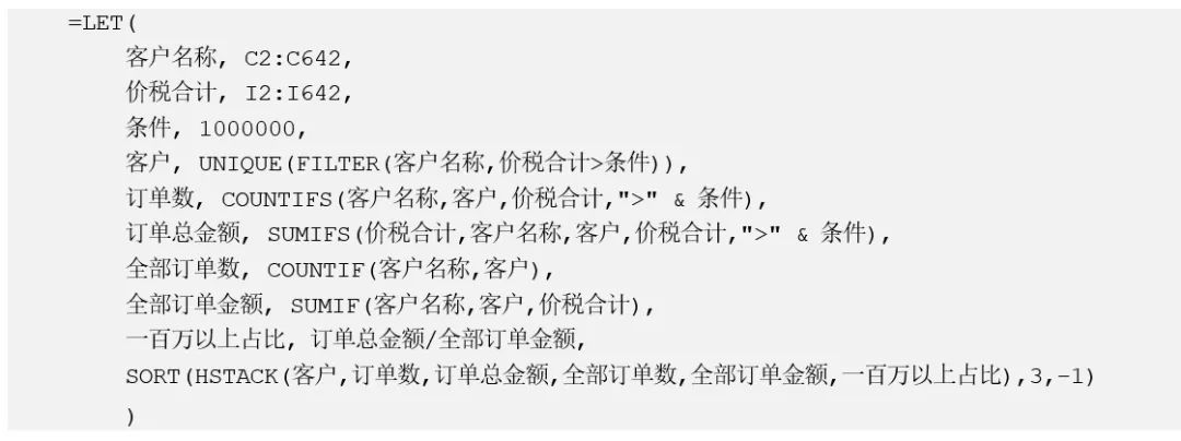 Excel 2024/365新函数系列讲座(33):LET函数(2)—— 经典应用 本篇文章只给出相应的案例数据及统计公式,具体原理不再介绍,因为在LET函数里,也是一些常规函数的具体应用,如果你对这些常规函数都不熟悉,那么略过此文,好好去学习常规函数吧。 下面的例子统计每个客户的全部订单数、全部订单金额,100万以上的订单数、订单金额,以及占该客户全部订单数和订单金额的比例。 参考公式如下,这个公式主要是练习LET函数简化公式,并不是一个最简单的公式,这点要注意。