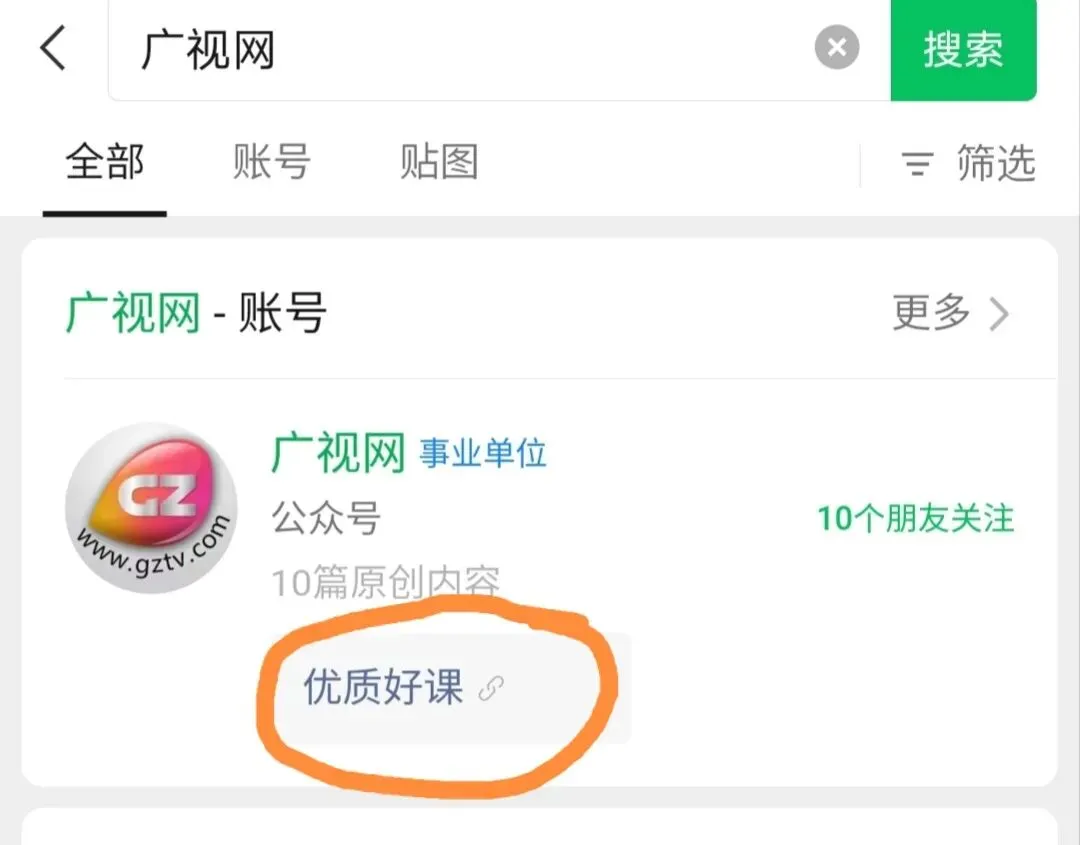 1、打开微信,在顶部搜索框输入广视网,找到官方公众号并关注,可以直接点开优质好课进入,如图。