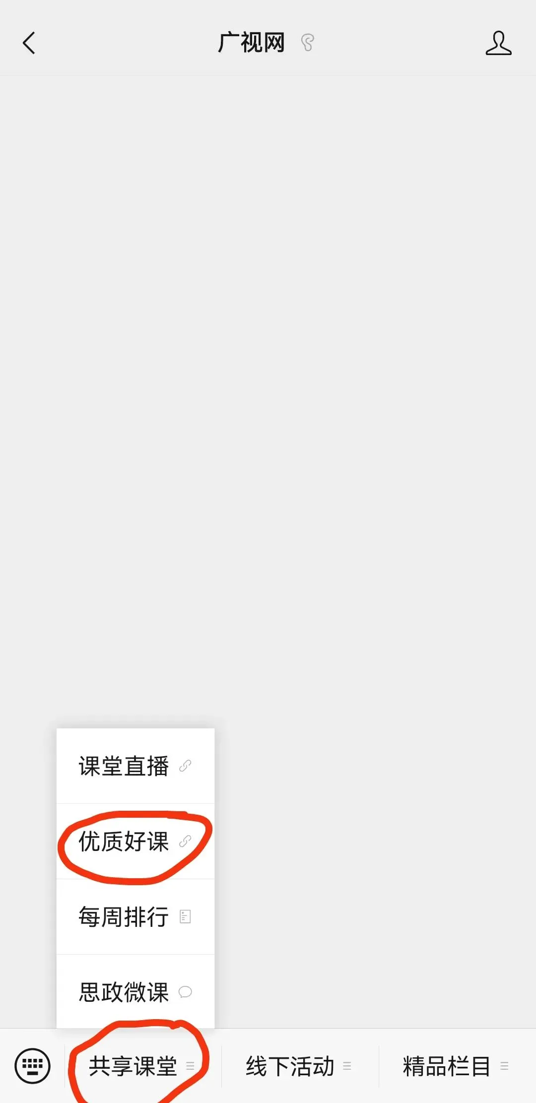 2、如果关注公众号后,首页找不到优质好课!可以跳到“私聊”的界面,从底部菜单栏即最左下角的“共享课堂”那里找出优质好课点开,如图。