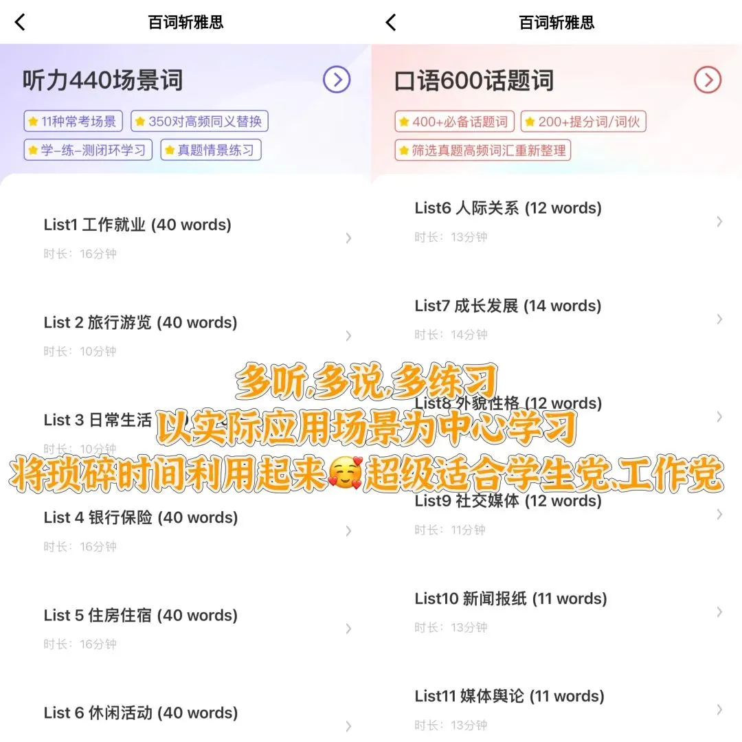 百词斩雅思集背单词、影子跟读、口语题库、听力练习、阅读写作、技巧方法、真题模拟等多功能于一身,覆盖英语学习各个板块。电脑/手机/iPad都能用!无论在宿舍、地铁、咖啡厅还是办公室、图书馆等都可以随时随地学习。时间有限,也可以灵活安排!