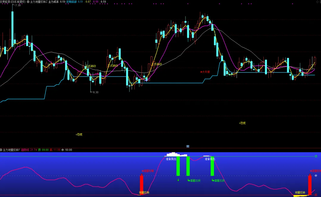指标通过计算股价在长期周期中的相对位置形成趋势线,结合动态价格区间识别地量反转机会。当趋势线从极低区域向上突破且价格低于地量反转线时产生买入信号;当趋势线进入极高区域且价格高于地量反转线时发出卖出警示。策略分准备与执行两阶段:准备阶段提示潜在机会,执行阶段在趋势确认时操作。