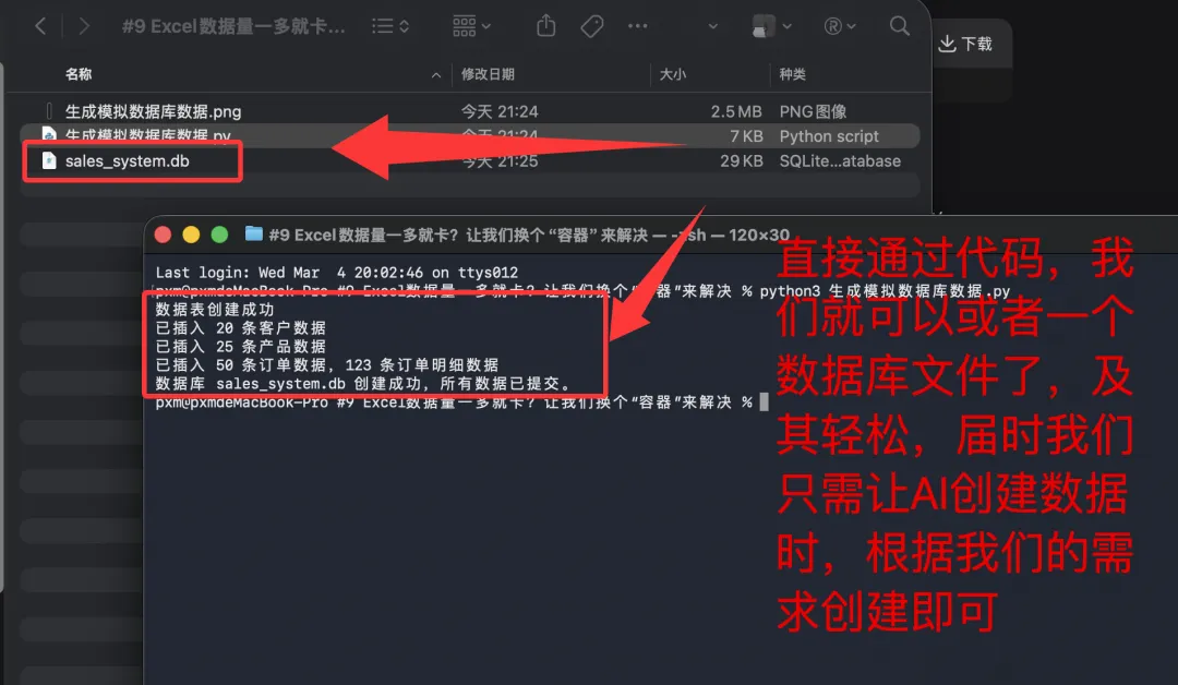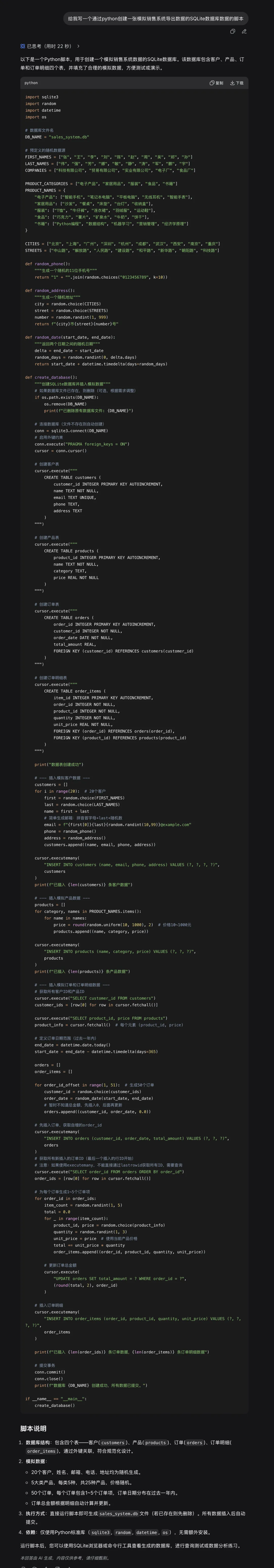 现在我来告诉大家我们如何使用SQLite,其实我们都完全不用管它,比如我们只需要告诉AI,给我写一个通过python创建一张模拟销售系统导出数据的SQLite数据库数据的脚本,我们就可以有一个SQLite数据库文件了: