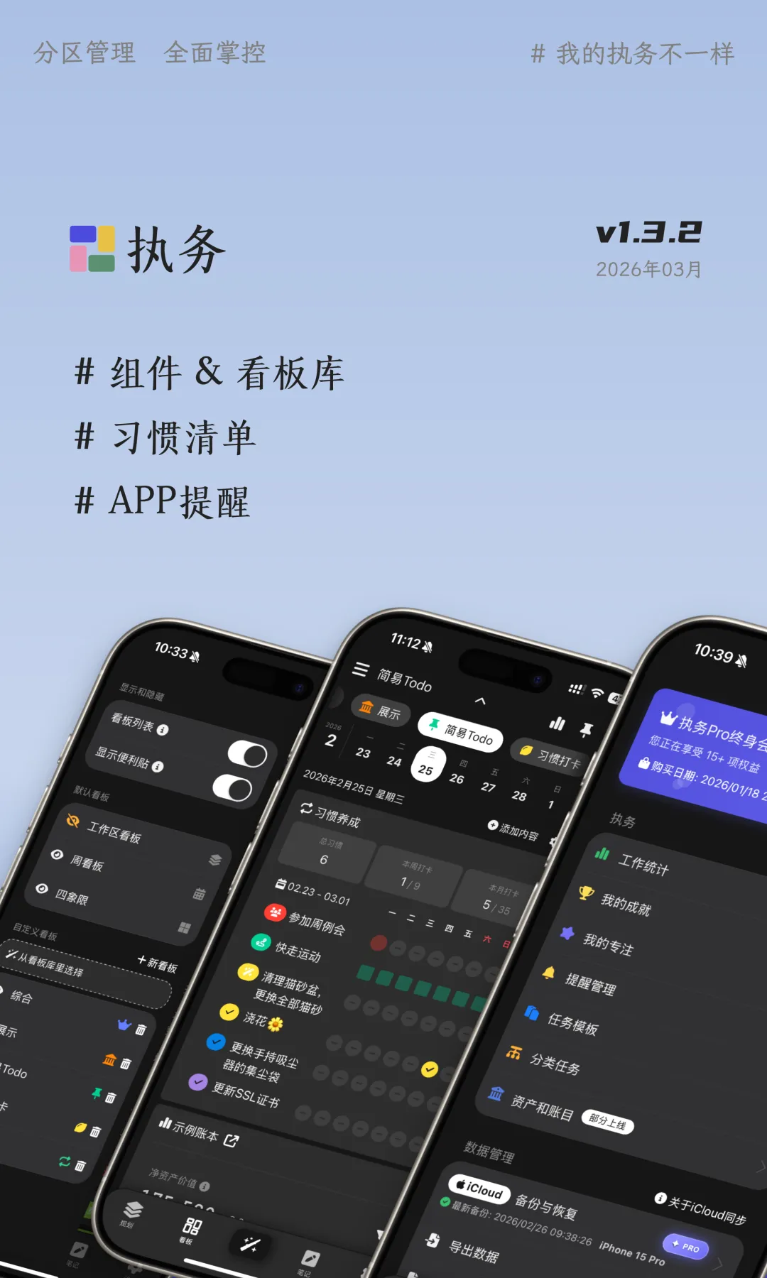 这一次的执务带来了全新的组件库设计,增加了更进一步的“看板库”,相信大家用起来一定会更顺手;此外,习惯养成也做了更便捷的优化,支持打卡后顺延,可以配置习惯的图标和配色,等等;还根据@ 秋秋呀 等用户的反馈增加了通知提醒功能。还有其他诸多功能优化和问题修复,执务正在变得更加成熟和方便。