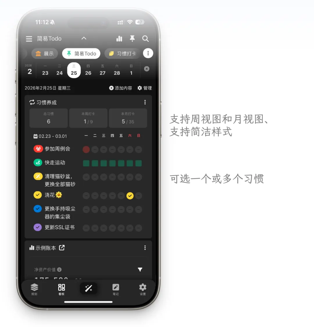 4. 新增习惯清单组件,用户可以自定义要展示在里面的习惯列表,支持设置简洁模式、完整模式,支持显示周视图、月视图