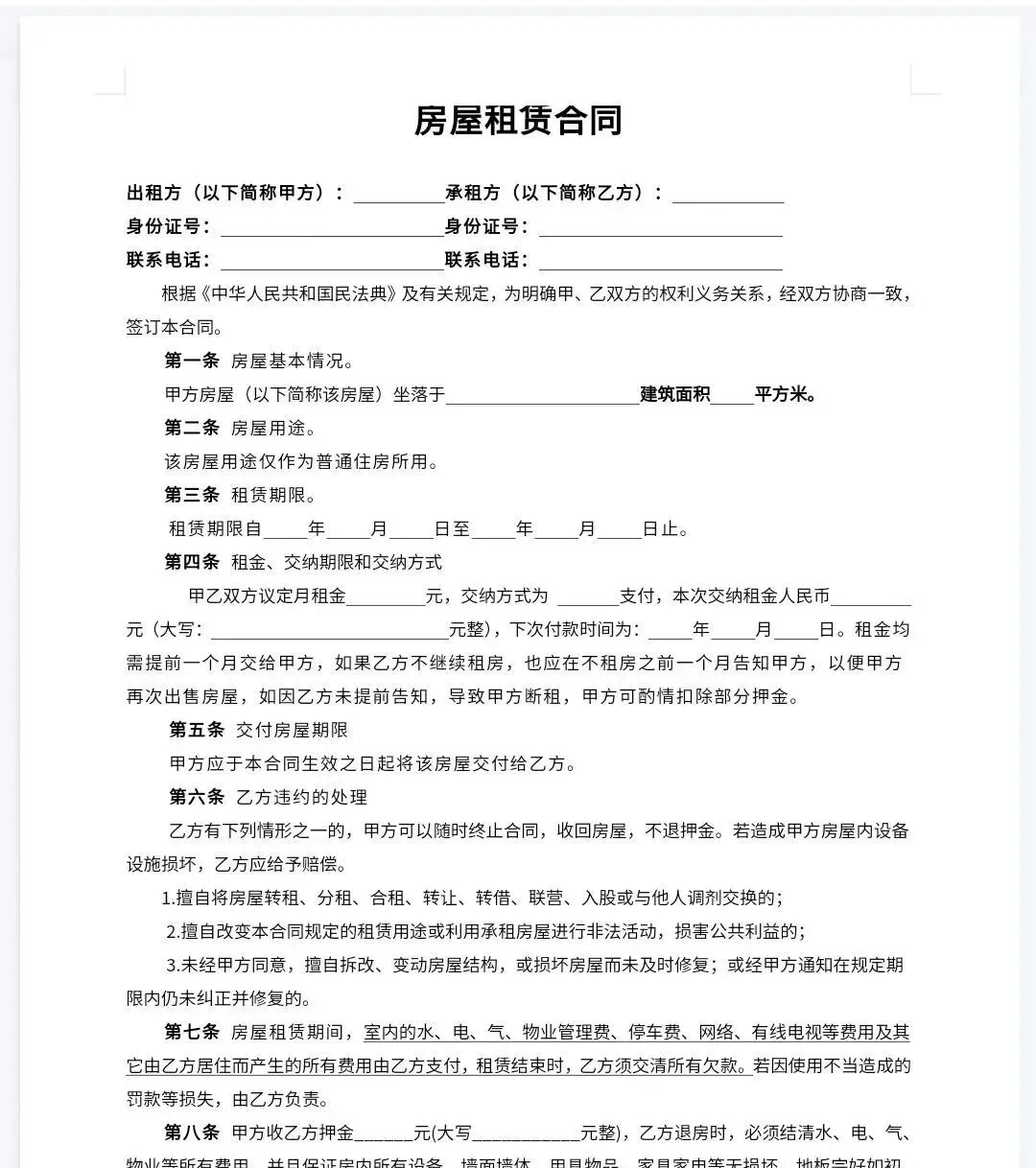 房屋租赁合同模板(word电子版下载)!