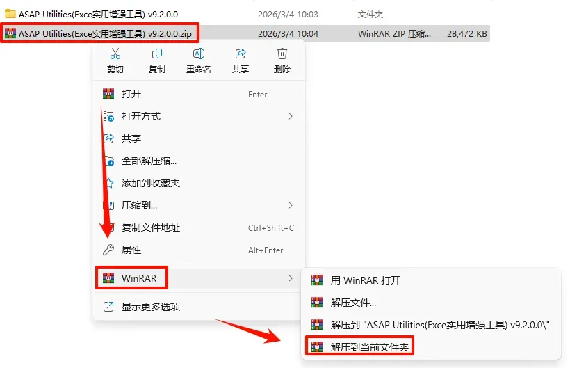 1.选中下载的压缩包,然后鼠标右键选择“解压到当前文件夹”(没有解压选项点这里)