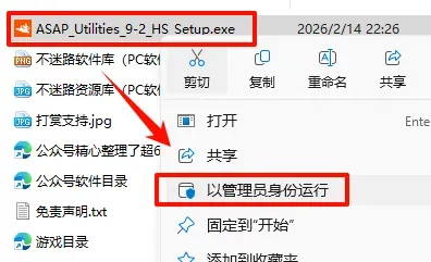2.打开刚刚解压的文件夹,鼠标右键点击“ASAP_Utilities_9-2_HS_Setup.exe”选择“以管理员身份运行