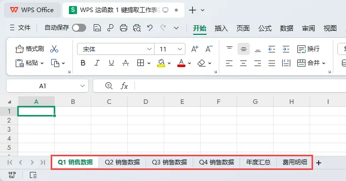 我们的工作簿里有6个工作表,名称是:Q1销售数据、Q2销售数据、Q3销售数据、Q4销售数据、年度汇总、费用明细