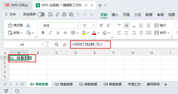 在 “Q1 销售数据” 工作表里,想快速标注当前表名,不用手动输入(避免输错)。