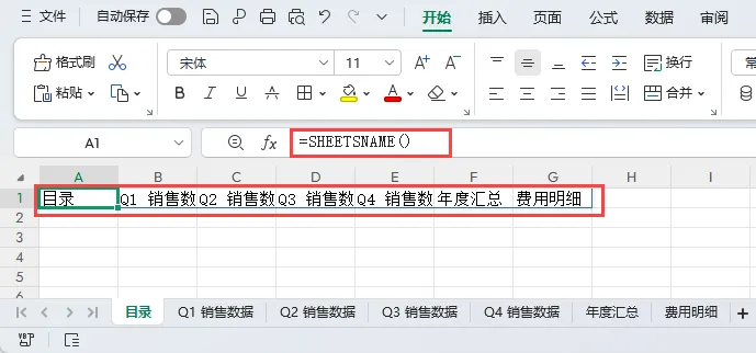 输入公式:=SHEETSNAME(,1)(第二个参数 “1” 代表竖排,默认 0 是横排),按回车。