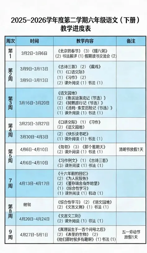 2025–2026学年度第二学期六年级语文(下册)教学进度表