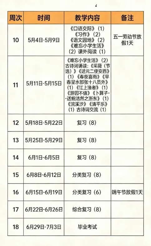部编版语文六年级下册教学计划及进度表,可下载打印!