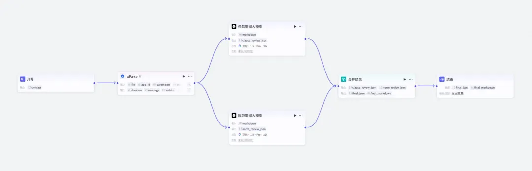 Coze工作流搭建演示(文档解析–条款审阅–规范审阅–合并结果输出)