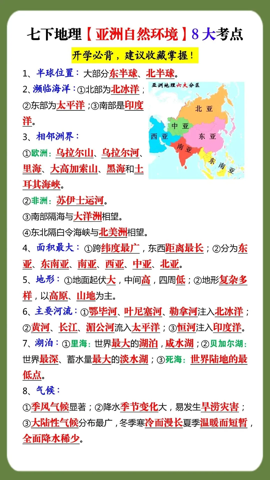 七下地理【亚洲自然环境】8大考点(可打印)开学必背,建议收藏掌握! 初中生日常 老师今天整理了七下地理【亚洲自然环境】8大考点,开学必背,建议收藏掌握! 电子版预览 初中生配套学习教辅 如何领取这个电子版资料