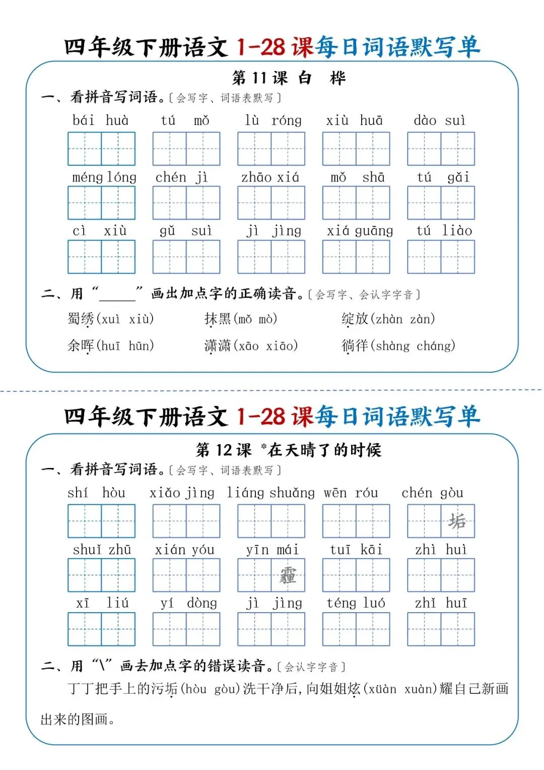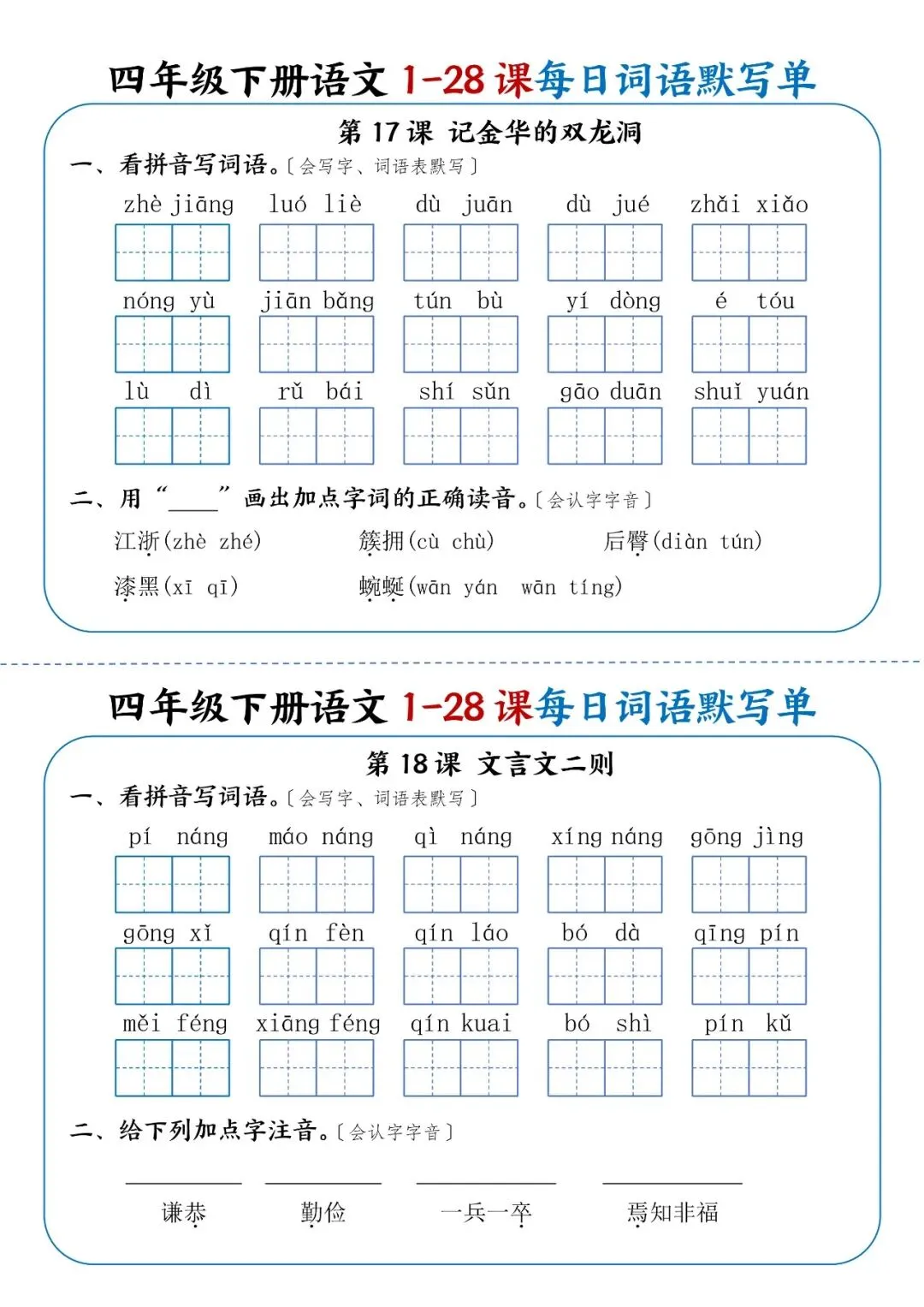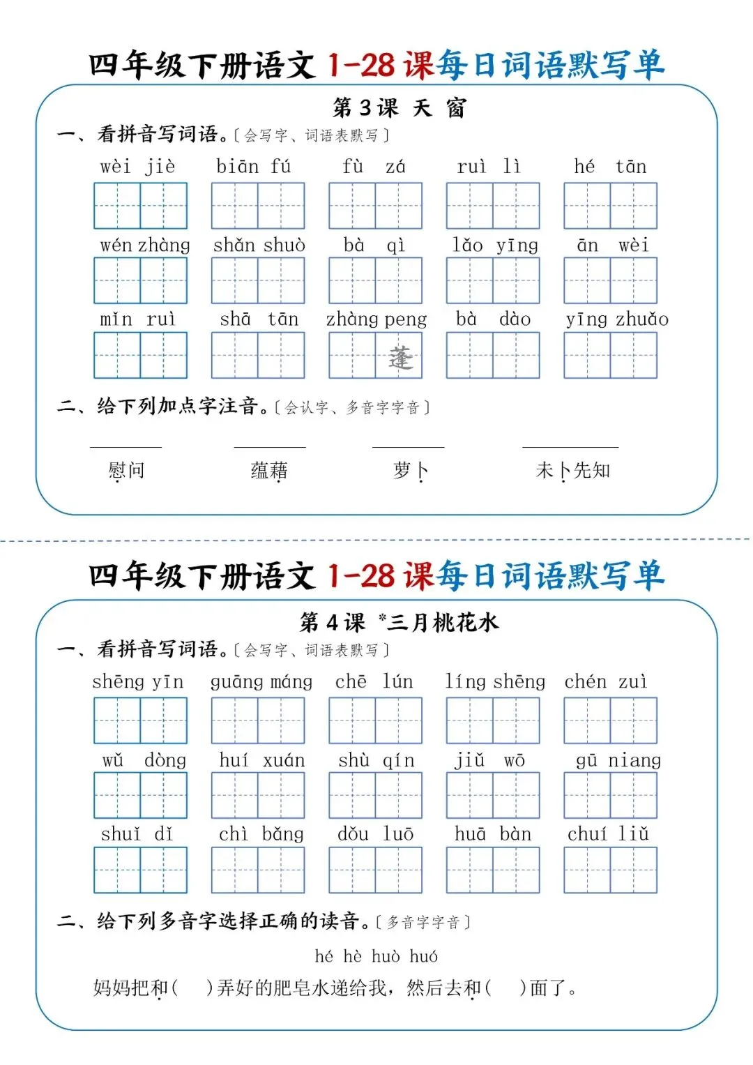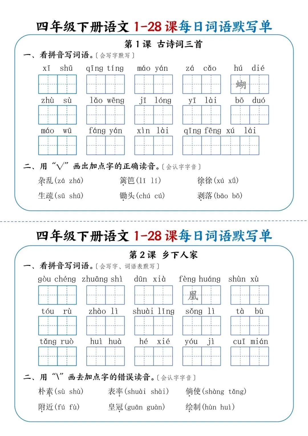 四下语文26春【每日词语默写单】,可下载打印 文末有高清电子版领取方式 由于篇幅有限,高清完整版请下载电子版哦 领取完整电子版方式: ①:发财的小手点一点右下角“👍”和“❤️” ②:关注公众号后,在对话框中回复:009 (点击名片可直接关注)↑↑↑