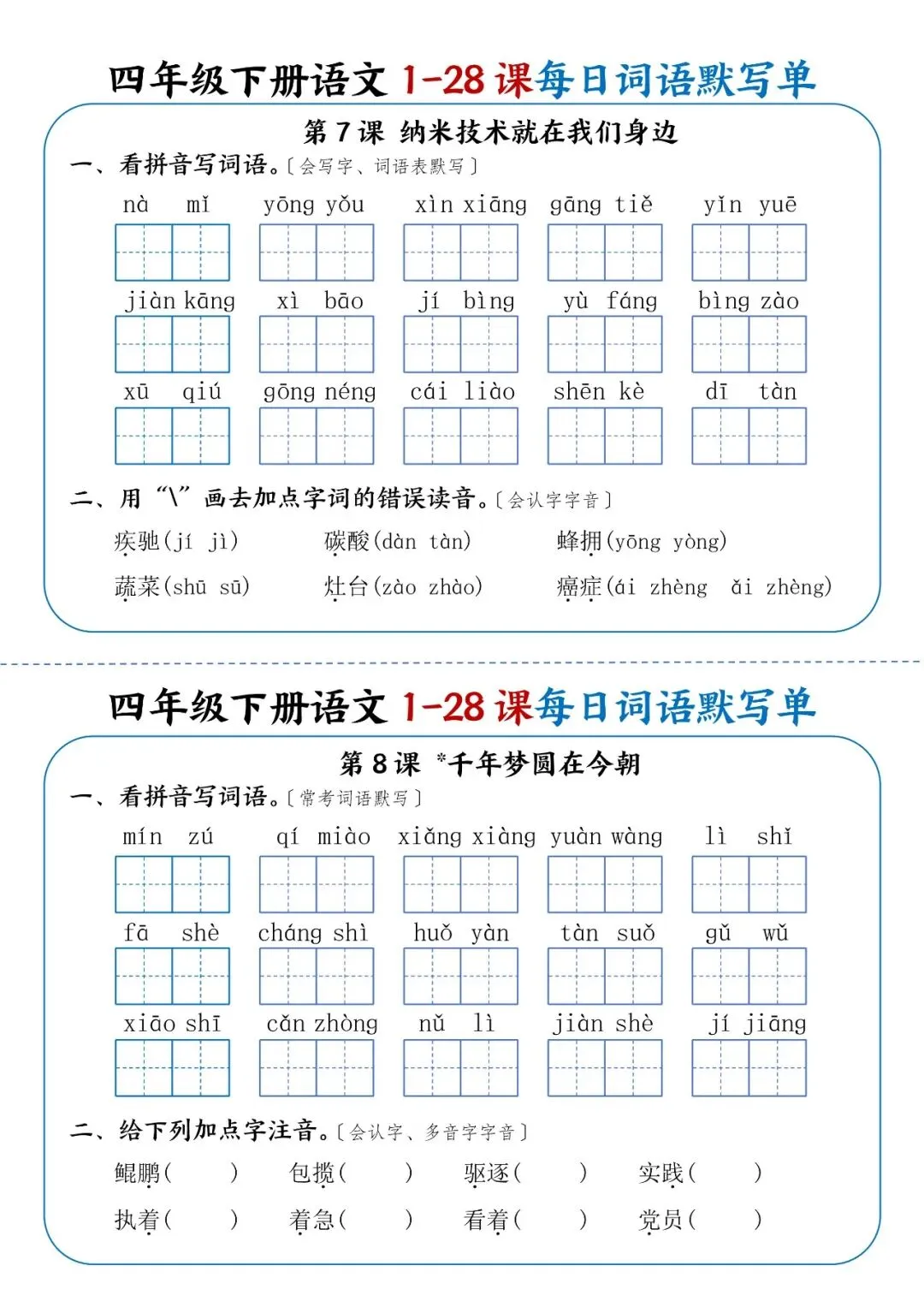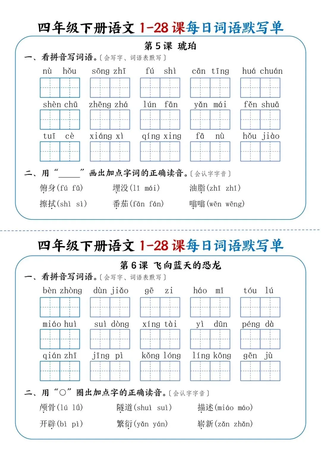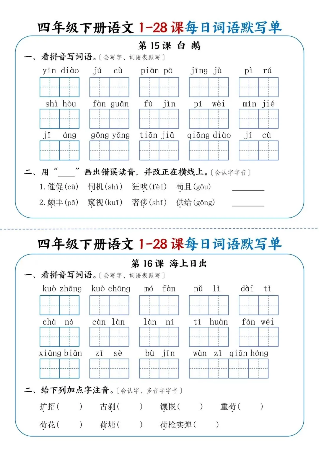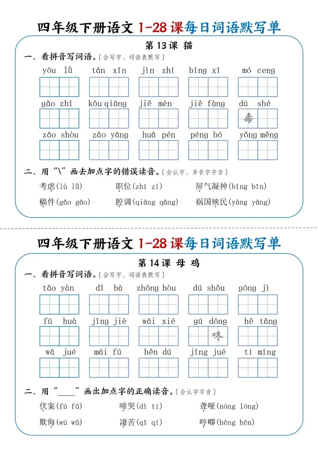 四下语文26春【每日词语默写单】,可下载打印 文末有高清电子版领取方式 由于篇幅有限,高清完整版请下载电子版哦 领取完整电子版方式: ①:发财的小手点一点右下角“👍”和“❤️” ②:关注公众号后,在对话框中回复:009 (点击名片可直接关注)↑↑↑