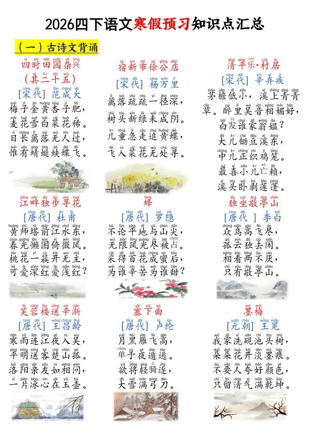 四年级下册语文寒假预习知识点汇总,电子版可打印