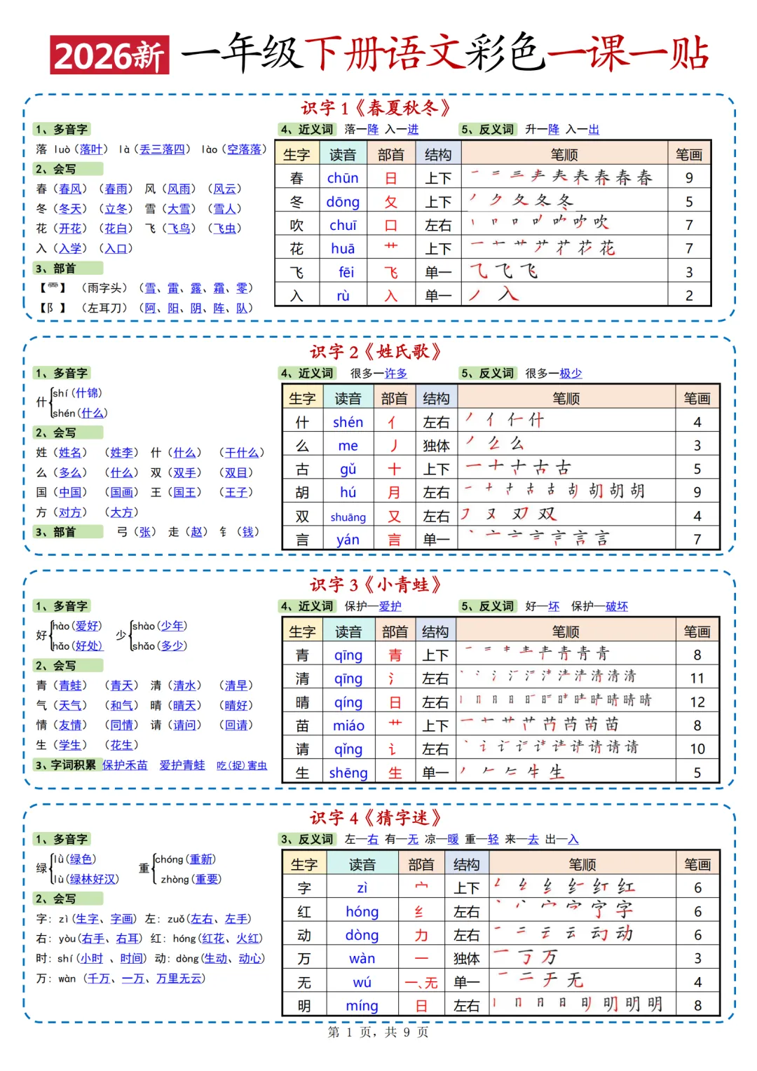 新版一年级下册语文《每课重点一课一贴》,电子版可下载
