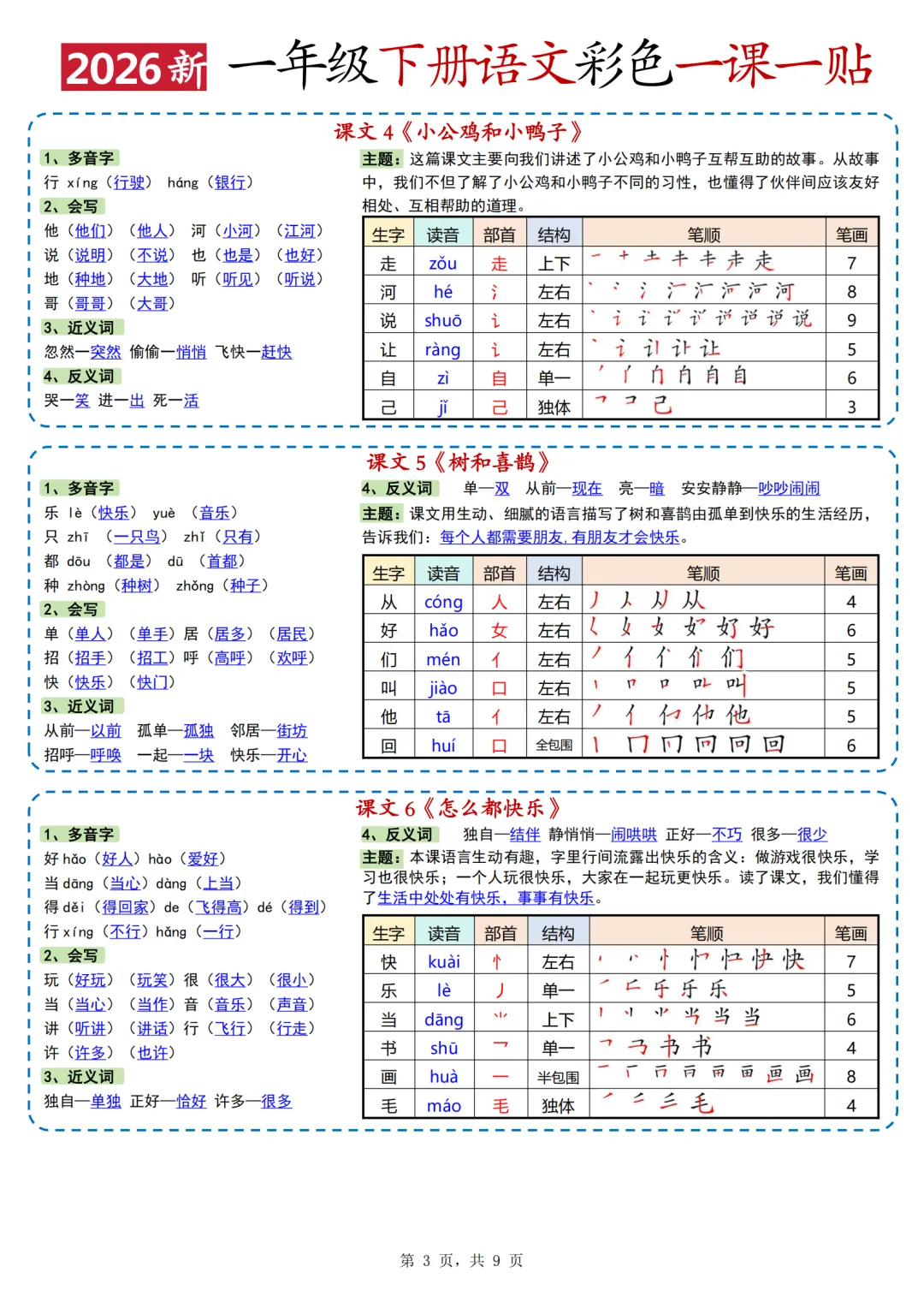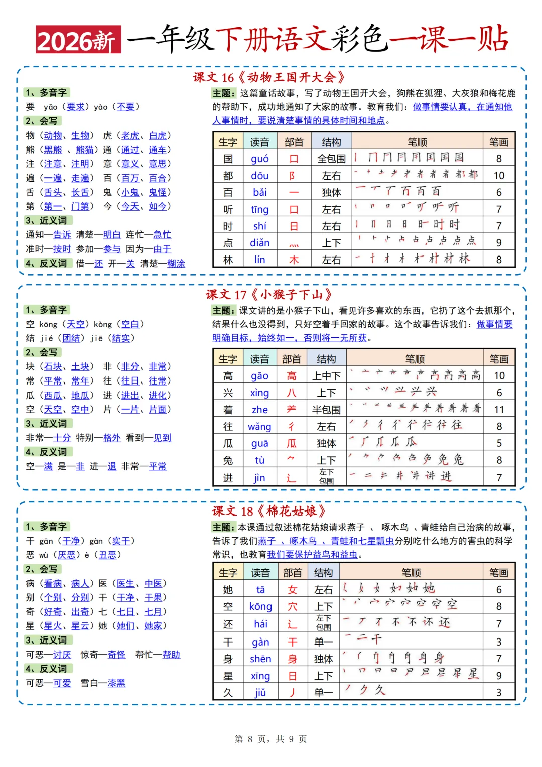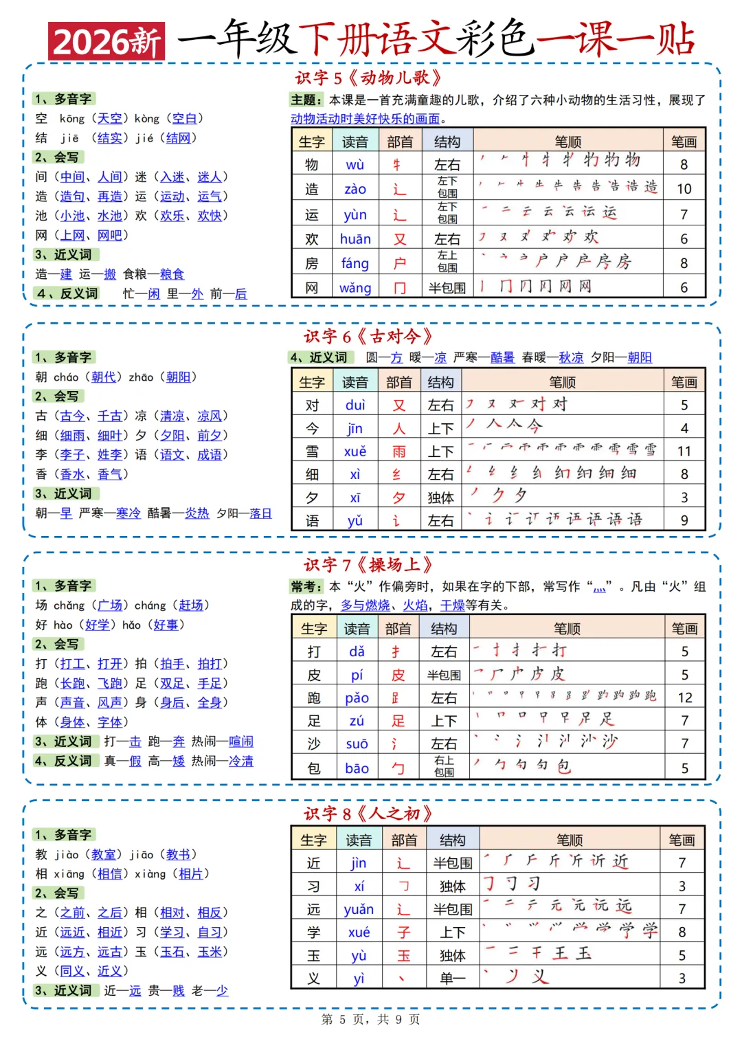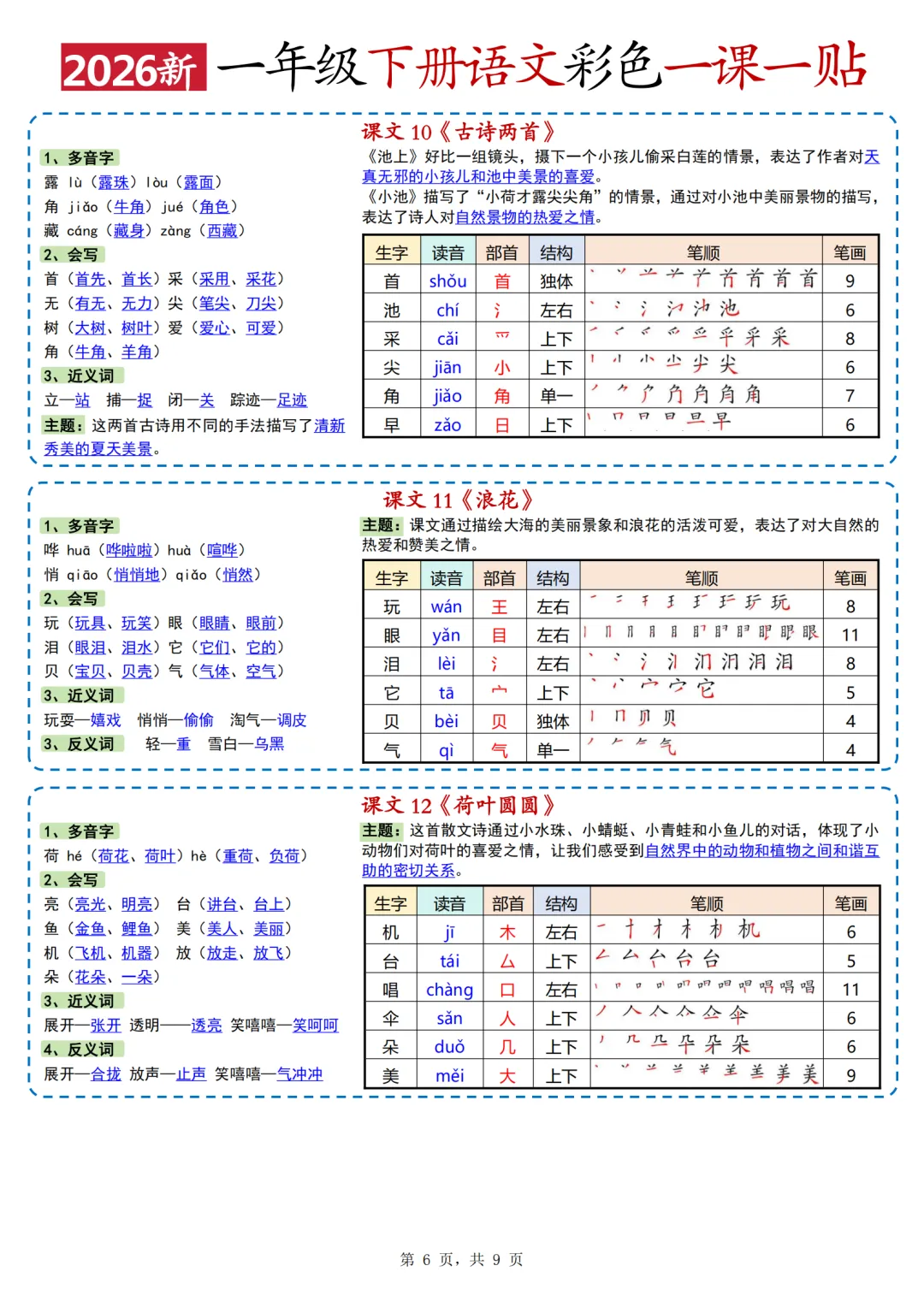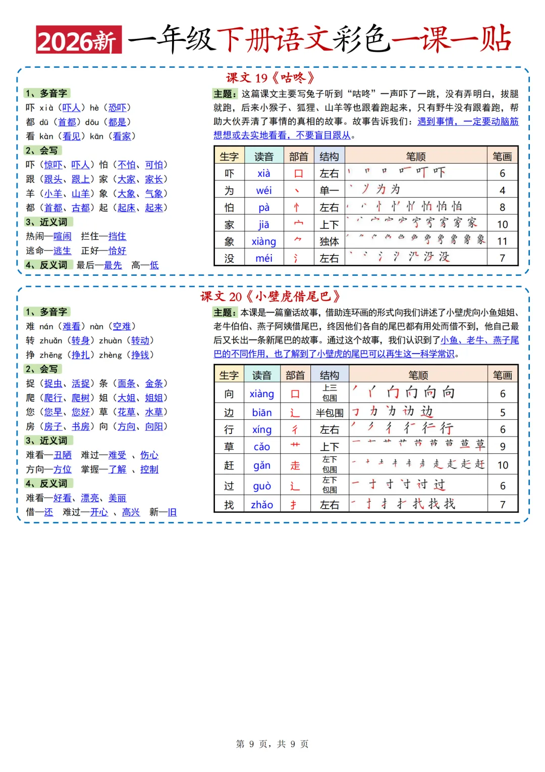 26年人教版一年级下册语文《每课重点一课一贴》,共10页,电子版可打印可下载,这份一下语文课课贴,包含了每篇课文的会写字、多音字、词语积累、近反义词、课文主题等内容。需要的家长抓紧领取上这份语文课课贴,用不干胶打印出来,裁剪粘贴到对应的课文位置,让孩子的语文学习更高效。