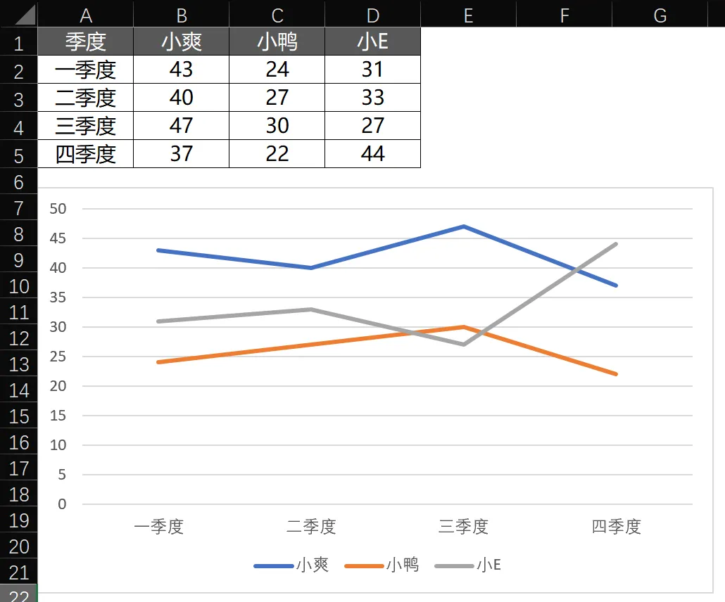 折线图可以是可以,但是折线图只能看出不同业务员在一年四个季度中的趋势情况。还是不够直观。